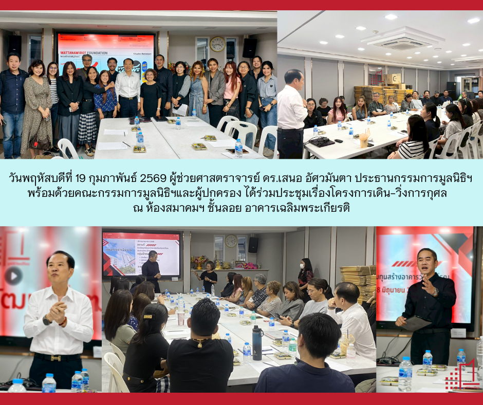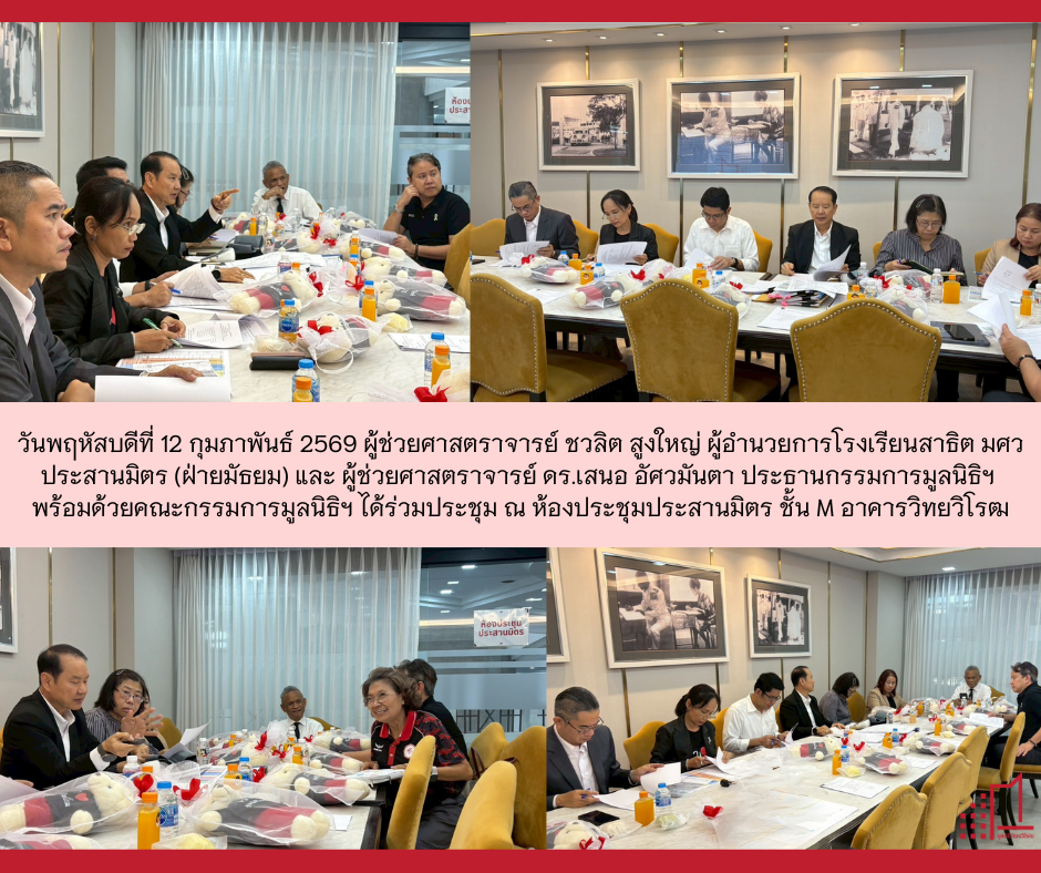 วันพฤหัสบดีที่ 12 กุมภาพันธ์ 2569 ผู้ช่วยศาสตราจารย์ ชวลิต สูงใหญ่ ผู้อำนวยการโรงเรียนสาธิต มศว ประสานมิตร (ฝ่ายมัธยม) และ ผู้ช่วยศาสตราจารย์ ดร.เสนอ อัศวมันตา ประธานกรรมการมูลนิธิฯพร้อมด้วยคณะกรรมการมูลนิธิฯ ได้ร่วมประชุม ณ ห้องประชุมประสานมิตร ชั้น M อาคารวิทยวิโรฒ